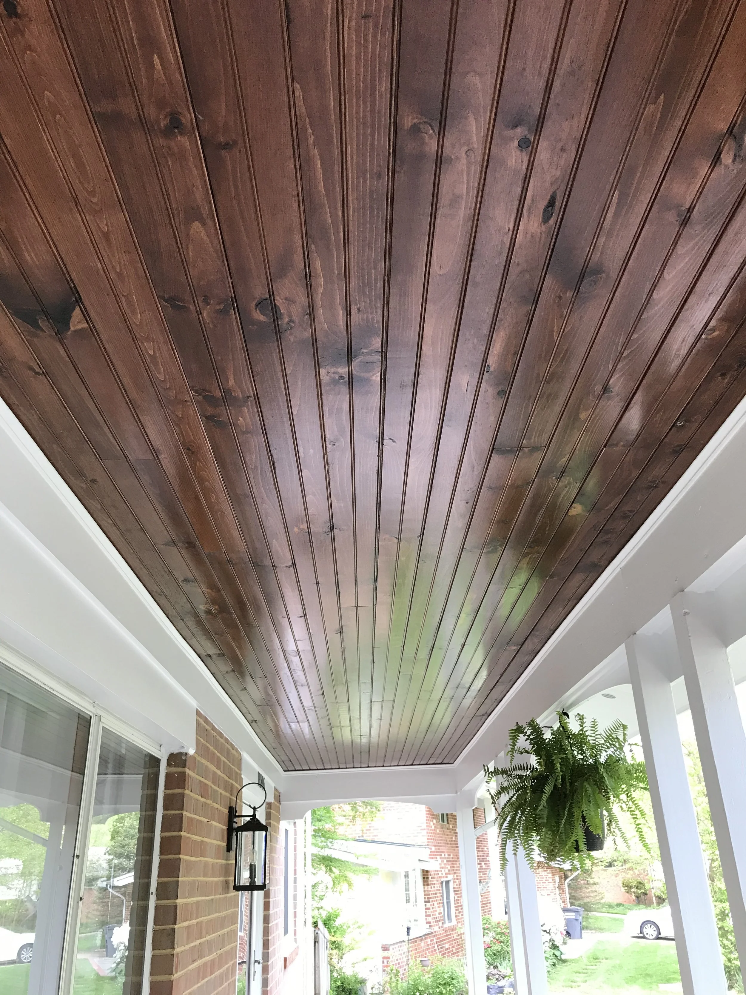 Spruce up your porch or carport ceiling with custom-stained, long-lasting wood paneling!